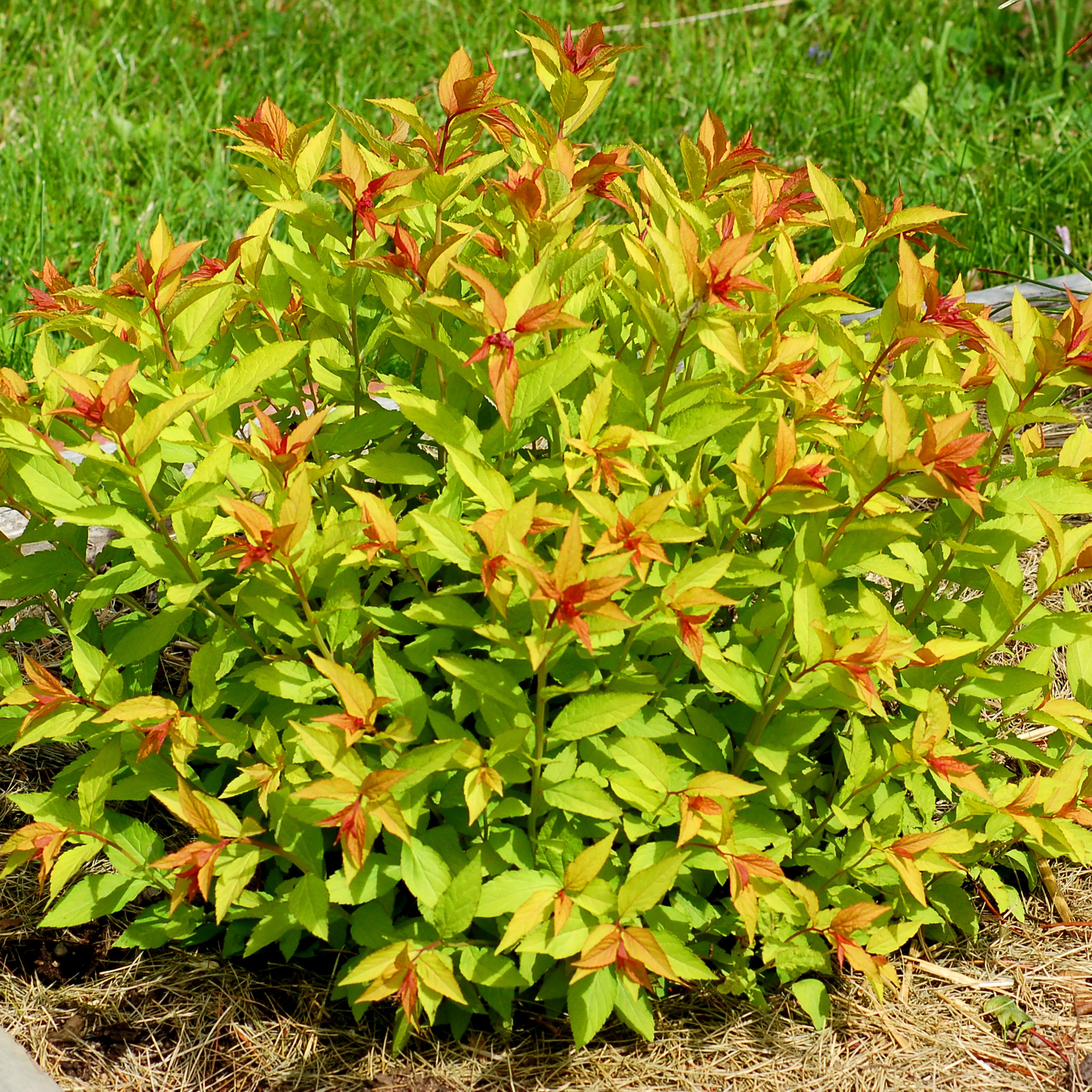 Goldflame Spirea displays a amazing array of colors from its golden green foliage tinged in burgundy to its pink blooms in late spring and finally in the fall it fades to a reddish orange.